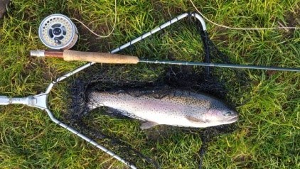 Lunch, and I have to say I had to excuse myself (quite rude really) to get back to the water with all batteries, mine and the phone, recharged. Sticking with the ‘daddy’ I moved to a different location and quietly approached the water where I saw a good sized fish cruising along and feeding at the surface.The daddy was despatched just in front of the last rise and without any hesitation the fly disappeared and I tightened into a good fish. At first the fish fought strongly but rather disappointingly it ran out of steam way before any of the smaller ones I had caught in the morning but it was netted, photographed (whether it liked it or not) and quickly returned to the water to fight another day – if it gets itself into better shape.