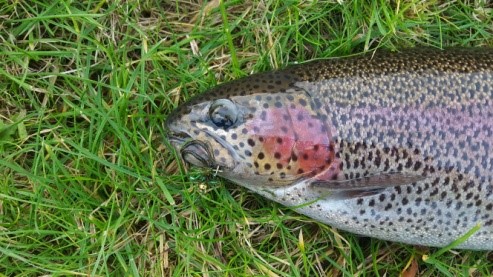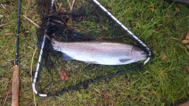 I set off from the lodge after coffee, wet the flies in the first bit of lake I came to which promptly sent 3 bow waves heading for deeper water and a lesson that this might not be as easy as I thought. Ten minutes after starting I had a good pull from a rainbow trout to the green damsel fly imitation, but missed it, and the next 3 but eventually I improved and hooked and landed my first trout of about 2lbs. An excellent fight on the light tackle and a bit of showboating by getting it on the reel to hear that screaming sound that anglers love as their quarry dives for the weeds and strips line from the reel – marvellous. Safely landed, hook removed (with wet hands) and the fish was promptly returned to the water. A quick relocation down the lake to fish an undisturbed patch and 5 minutes later another strong pull followed by the total loss of fly, leader and braided loop from the fly line as a good sized fish grabbed the lot. Mental note – check your kit if you haven’t used it for some time, especially if the trout are larger – 45 years of fishing and I still get some of the basics wrong. A total of 4 trout were caught for the morning session ranging between 1.5-2.5lbs, all rainbows, all in good condition and all returned safely to fight another day, and each on a different fly. No photos – flat battery remember! The last being on a daddy-long-legs fished on the surface – great fun.